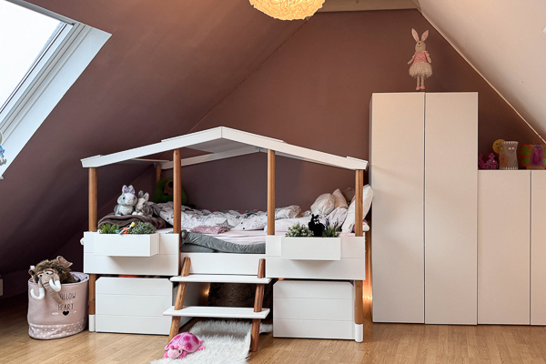 Zur Südseite hin liegt ein weiteres Zimmer mit vollständig zu öffnender, bodentiefer Fensterfront und Zugang zur schönen Loggia, auf der sich der Abend entspannt ausklingen lässt. Über eine Treppe gelangen Sie in das Dachgeschoss, das zusätzliche ca. 30 m² Fläche zur individuellen Nutzung bietet.